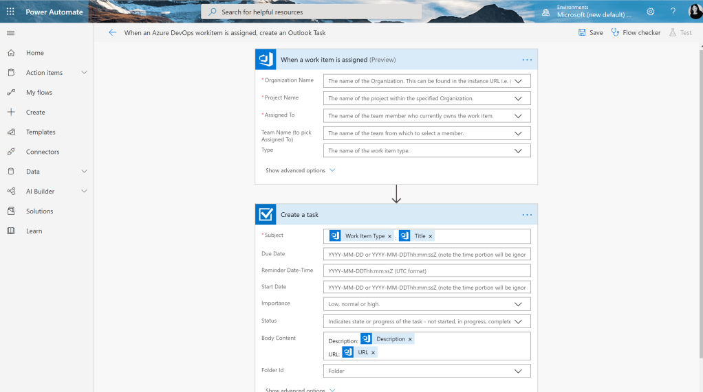 In the following example, I have setup an automated workflow to create a new Outlook task when I am assigned a task in Azure DevOps: