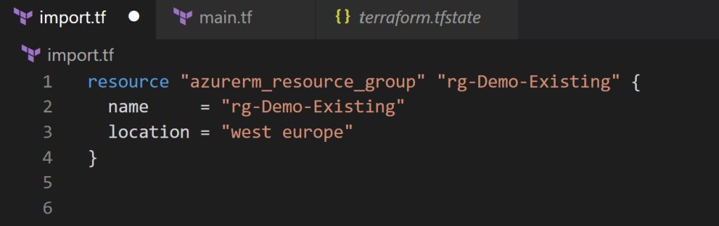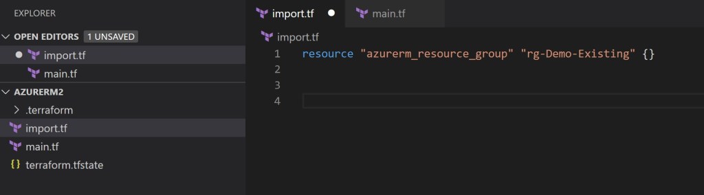 2. Create an ‘import.tf’ file at the same level as your ‘main.tf’ file, this will be used to manage imported variables. We will add the resource block for our existing resource group: