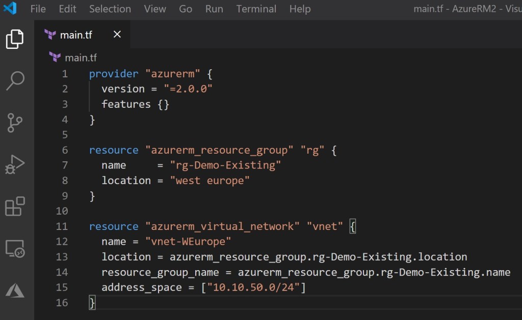 7. From here, you can begin adding in additional resources and reference the imported resource. In this demo I want to deploy a vNET to my resource group. I input the resource configuration for my vNET and can start using variables from my import file to keep my naming conventions and coding simplified (and repeatable). I write all my changes to my ‘main.tf’ file, then save (preferably to your favorite form of source control).