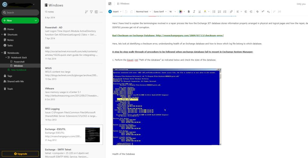 I remember owning a PowerShell 2.0 book and referencing it quite a bit. At that time in my career I managed everything in our tech estate (Exchange clusters, Citrix, VMware, WSUS, AD, SharePoint, Cisco …the list goes on). I was a massive walking knowledge base on Exchange Server and Active Directory at the time. I automated everything I could and queried everything using PowerShell. Up to that point in my career I had done numerous Exchange migrations but it was exciting being able to manage my own estate, but man, did it have problems. I have found an actual piece of documentation that I wrote in my Evernote: